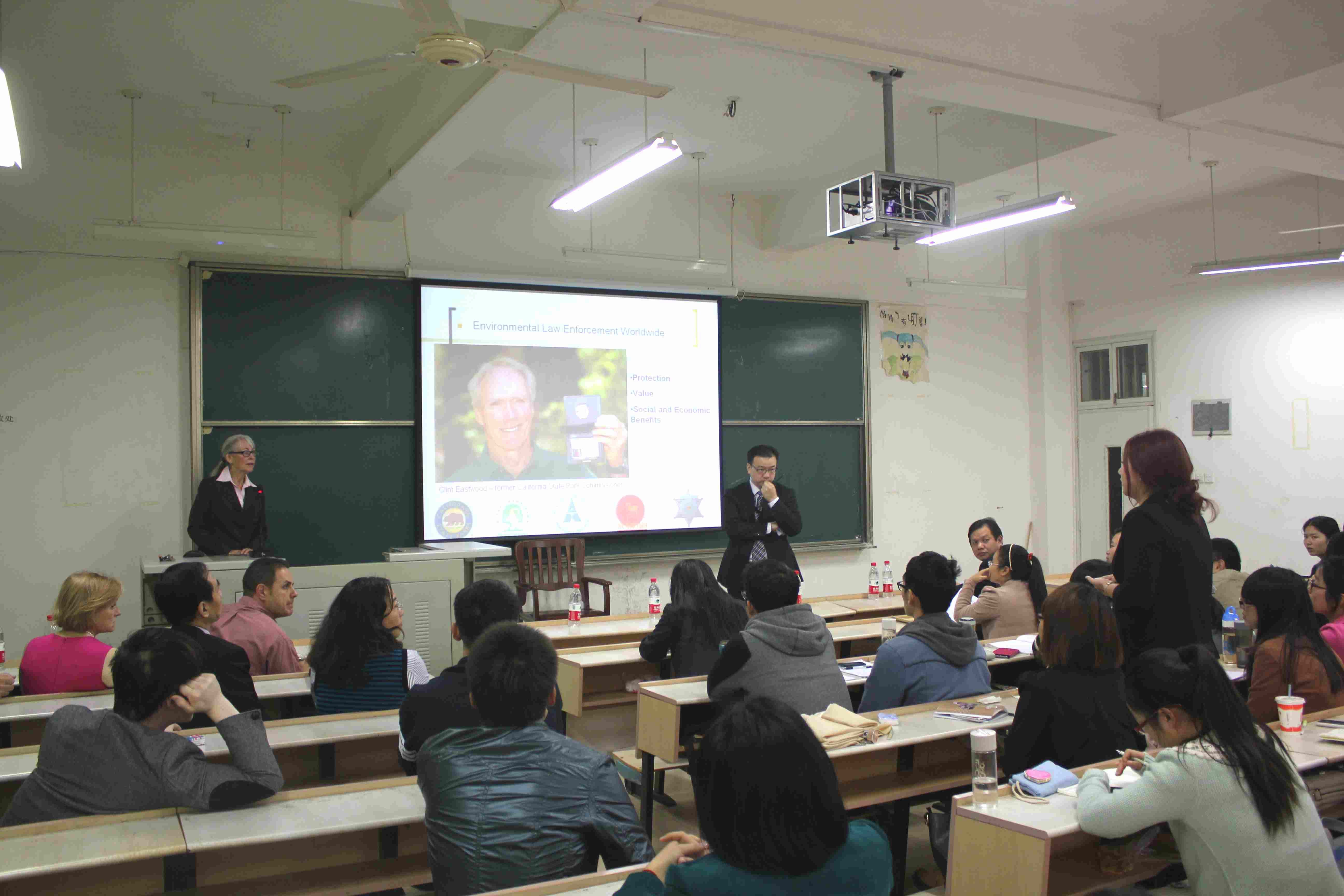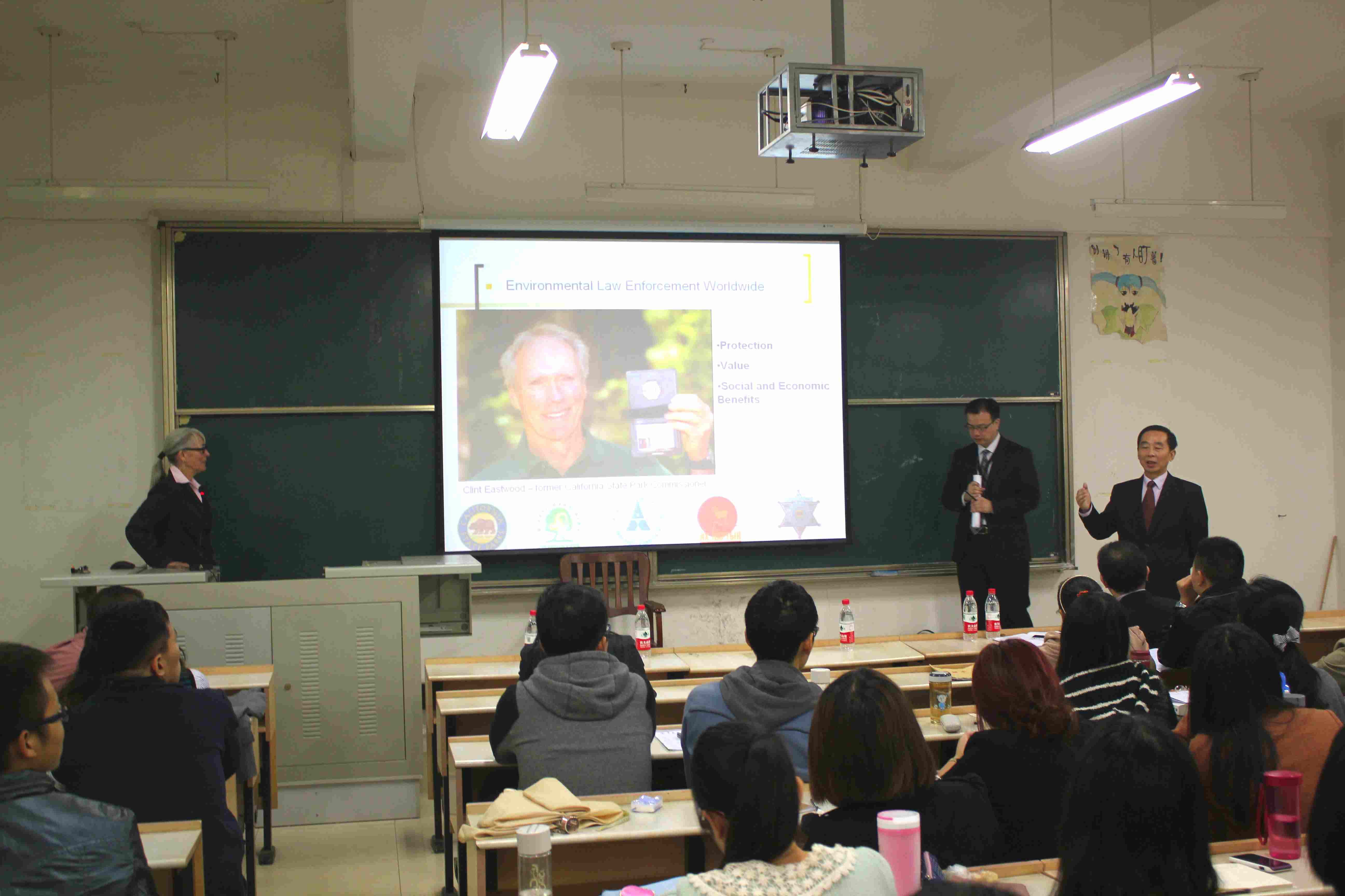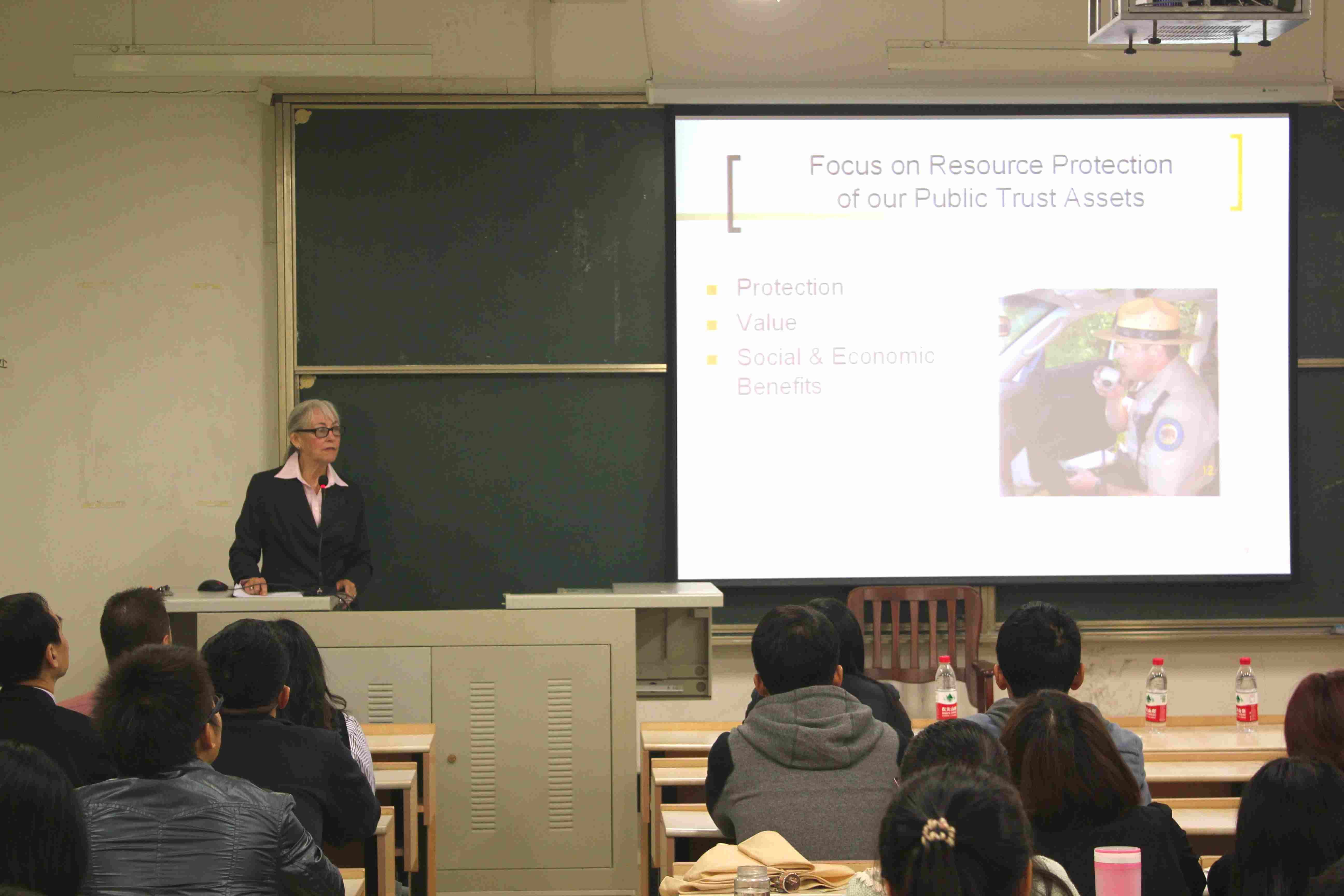 本次讲座由曾担任过美国加州州立公园执法局局长的Lynn女士主讲,她对于加州的公共环境资源保护和与其他国家地区的环境保护合作以及相关法律案件的处理有着很丰富的经验和很高的专业理解。首先,Lynn女士对于公共环境资源保护的历史发展做出了介绍,她提到蒙古是世界上第一个建立官方支持自然保护区的国家,早在1240年蒙古就开始进行相关的保护措施和自然园区规划。如今,加州州立公园保护区和蒙古、以色列等国家自然保护区已经形成了长期的合作和交流关系。接下来,Lynn女士则阐述了自然保护区的巡警的三个主要保护对象:第一个是自然环境资源,主要包括森林,山谷,海滨,海域以及海底的自然生态环境和古代留下的文明遗址。第二个是政府和当地环境保护组织合作设立的一些公共环境保护设备。第三个就是前往环境保护区旅游的游客的人身财产安全以及及时阻止人为的自然资源破坏相关的犯罪行为。