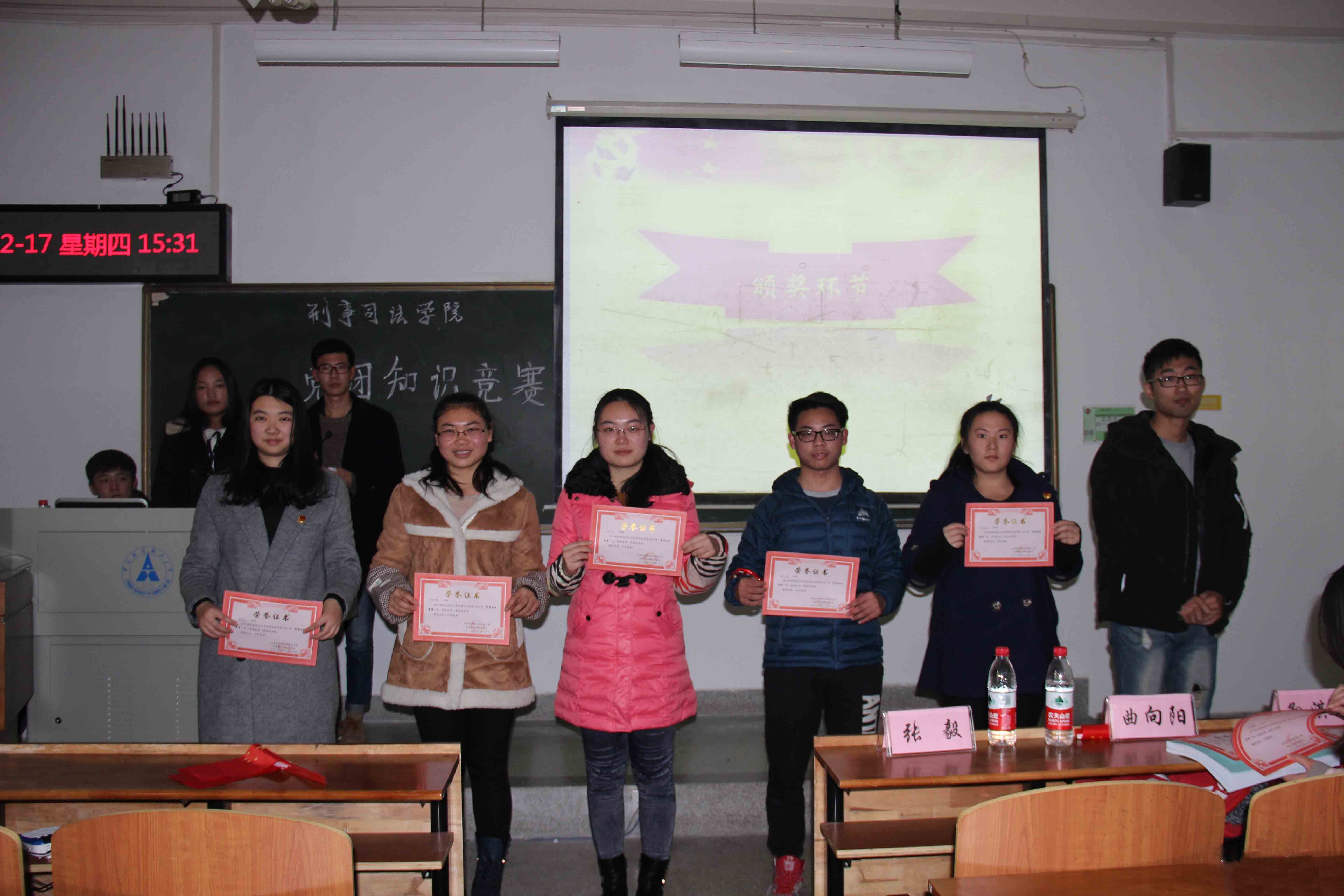 决赛中,各队选手紧咬比分,你追我赶,最终来自边管1401的张明诚、何勰同学凭借扎实的知识功底获得了赛事一等奖。而边管1501班选手与职侦1501班选手势均力敌、难分上下,进入附加赛环节。通过加分题的比拼,边管1501的孟志远、柳敬贤同学更胜一筹,获得二等奖。职侦1501的郭康康、陈家希同学获得三等奖。同时,边管1501班、职侦1501班、司法1502班获得优秀组织奖。