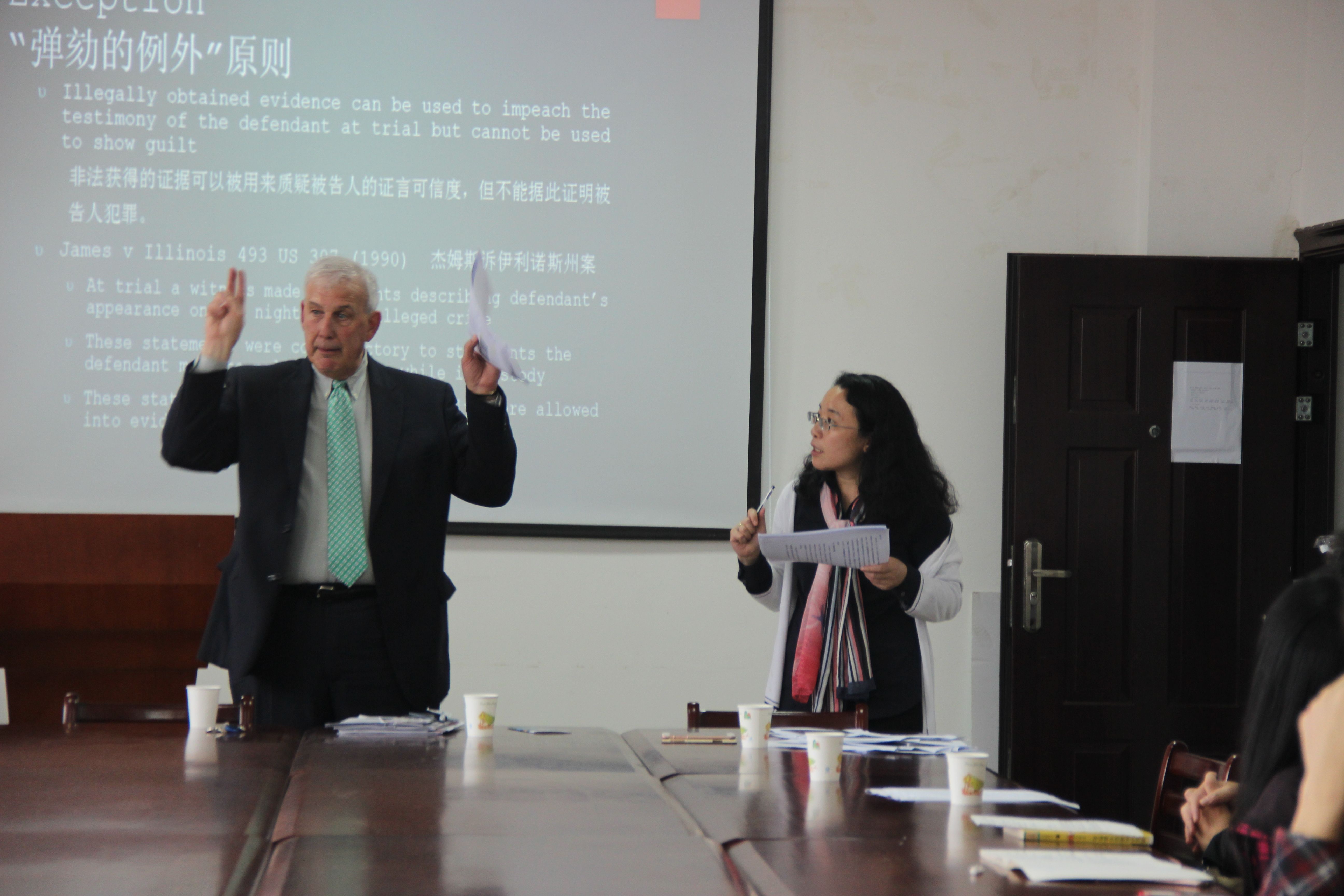 5月9日下午2:30,nba在线看 邀请到来自美国伊利诺大学法nba在线看 的教授、联邦大法官提名者、大律师Steven J Beckett教授在文治楼二楼会议室举办了一场“米兰达规则纪念五十年——非法证据排除规则是促进正义,还是阻碍正义”的学术讲座。nba在线看 院长胡向阳教授、副院长苏彩霞教授、院长助理郭泽强教授刘建华老师出席本次讲座,部分研究生、本科生聆听了本次讲座。讲座由nba在线看 副院长苏彩霞教授主持并全程翻译。