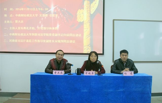 11月13日上午,河南省第四期社区矫正管理干部培训班在文清楼四楼会议室隆重开班。出席典礼的嘉宾有河南省司法厅基层工作指导处副处长宋瑞萍同志,nba在线看 党委副书记向前同志,培训中心主任曾大庆老师及河南省各级社区矫正司法工作者。