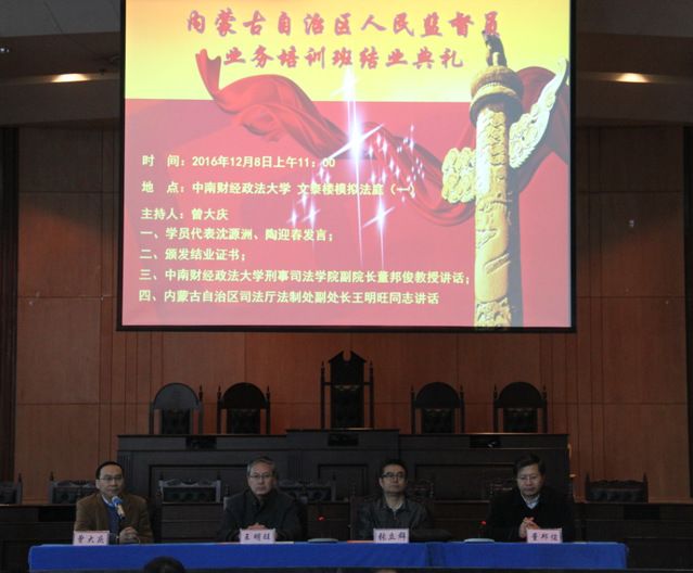 最后,内蒙古自治区司法厅法制处王明旺副处长首先表达了自治区司法厅、检察院对本次培训的高度重视,对我校领导和师生的支持以及最高检、湖北省检察院的鼎力相助表示衷心感谢。他表示,此次培训课程紧紧围绕最高检及司法部最新文件,理论与实务高度结合,有利于提高人民监督员业务水平。王处长还肯定了全体学员的学习态度,并强调在以后的工作中,人民监督员应不断学习、提高理论水平,依法认真履职,适应改革形势,迎接新的挑战。