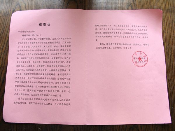 在九省通衢之都、中南繁华重镇,为期八天的益阳市公安机关领导干部能力提升研修班在贵校成功举办,八天的体验,非比寻常;八天的收获,无比丰厚。在此,谨向中南财经政法大学表示衷心的感谢并致以崇高的敬意!感谢校长杨灿明先生对开办培训班的高度重视,亲自在百忙中进行指导;感谢学校的精心组织和周密安排,姚莉副校长、邹进文副校长全面协调,亲临指导,nba在线看 李宏书记、胡向阳院长深入对接项目、统筹调度,nba在线看 培训中心曾大庆主任、朱俊红副主任不辞劳苦,全程跟班管理服务,无微不至;感谢教授们的精彩授课和答疑解惑,采用灵活多样的教学方法,保证了培训的精准度和实效性;感谢nba在线看 全体教师员工的细心周到和热情接待,为学员提供了良好的学习和生活条件。这一切都让我们深深感受到了中南财经政法大学“博文明理厚德济世”的优良校风、学风,也必将如润物细雨,长久影响和改革我们的公安工作。