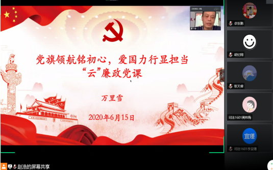 (通讯员 刘泽泂)6月15日下午2:30,nba在线看 党委副书记万里雪通过“腾讯会议”平台为nba在线看 2016级本科学生党支部党员讲授《党旗领航铭初心,爱国力行显担当》“云”廉政党课。nba在线看 2016级本科学生党支部全体成员聆听了此次党课。