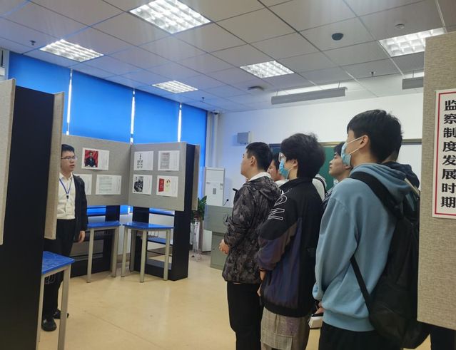 陈列室讲解员以年代为线索,在结合习近平法治思想的基础上,详细介绍了中国各个时期主要的监察制度、监察机构、监察职责等,尤其是以各种小故事的形式普及各年代典型的监察文化。在讲解的过程中,参观的老师、同学仔细聆听,认真观摩陈列室内展览的图片,并不时相互交流对监察制度与文化发展的理解。