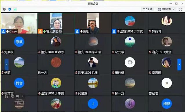 治安1801班级素质导师曾大庆老师主持了本次会议,出席本次会议的有国家一级就业指导师刘敏老师和平安保险武汉公司老总、中南财经政法大学杰出校友周明。