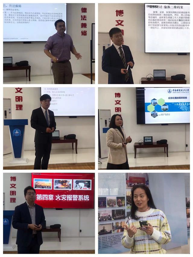 5位青年教师逐一进行20分钟的授课。第一位参赛教师张正宇就刑法解释进行讲解。第二位参赛教师姚培培讲述了财产犯罪疑难案例分析。第三位参赛教师王复春讲解了盗窃罪的客观构成要件。第四位参赛教师黎晓露就应急处置的现场安排进行课堂讲解。第五位参赛教师栾兴良以火灾报警系统的结构与使用方法作为课堂内容。