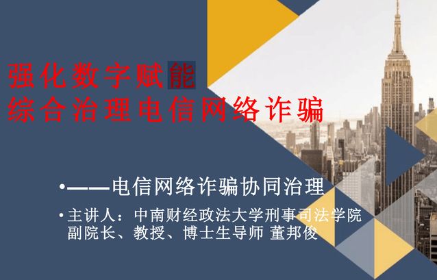 董邦俊教授的讲座从电信网络诈骗犯罪的背景、电信网络诈骗犯罪的特点、电信网络诈骗犯罪的动因及治理困境、电信网络诈骗犯罪的综合治理建议几个方面展开。