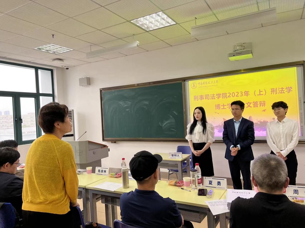 夏勇教授、王良顺教授、周详教授、魏汉涛教授担任答辩委员会委员。翟艺丹、牙韩选、刘纯燕三位博士生依次进行答辩。此外,部分刑法学硕、博士生参加了旁听。