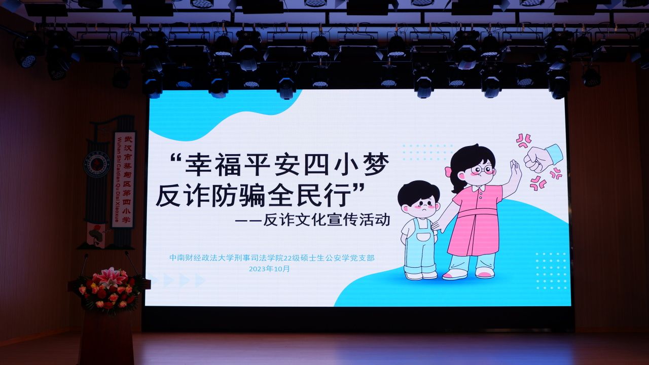 2022级硕士生公安学党支部党员及入党积极分子前往武汉市蔡甸区第四小学开展“幸福平安四小梦,反诈防骗全民行”反诈文化宣传活动,为学生们带来了一堂生动有趣的“反诈课”。