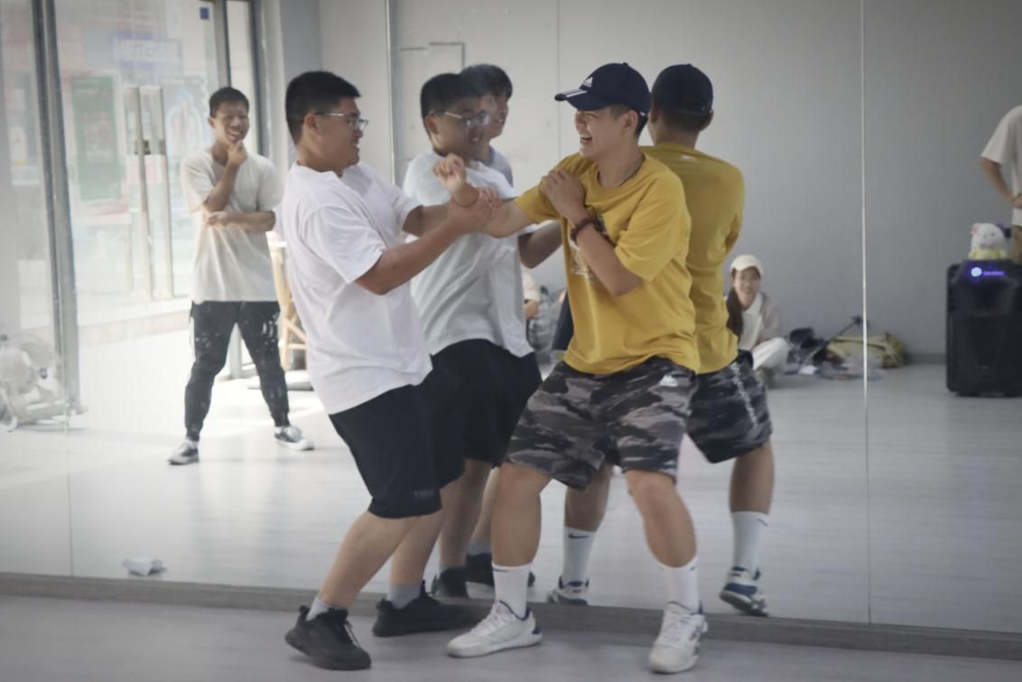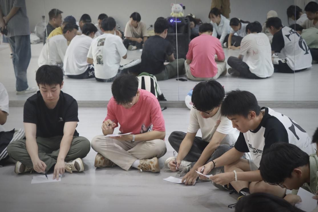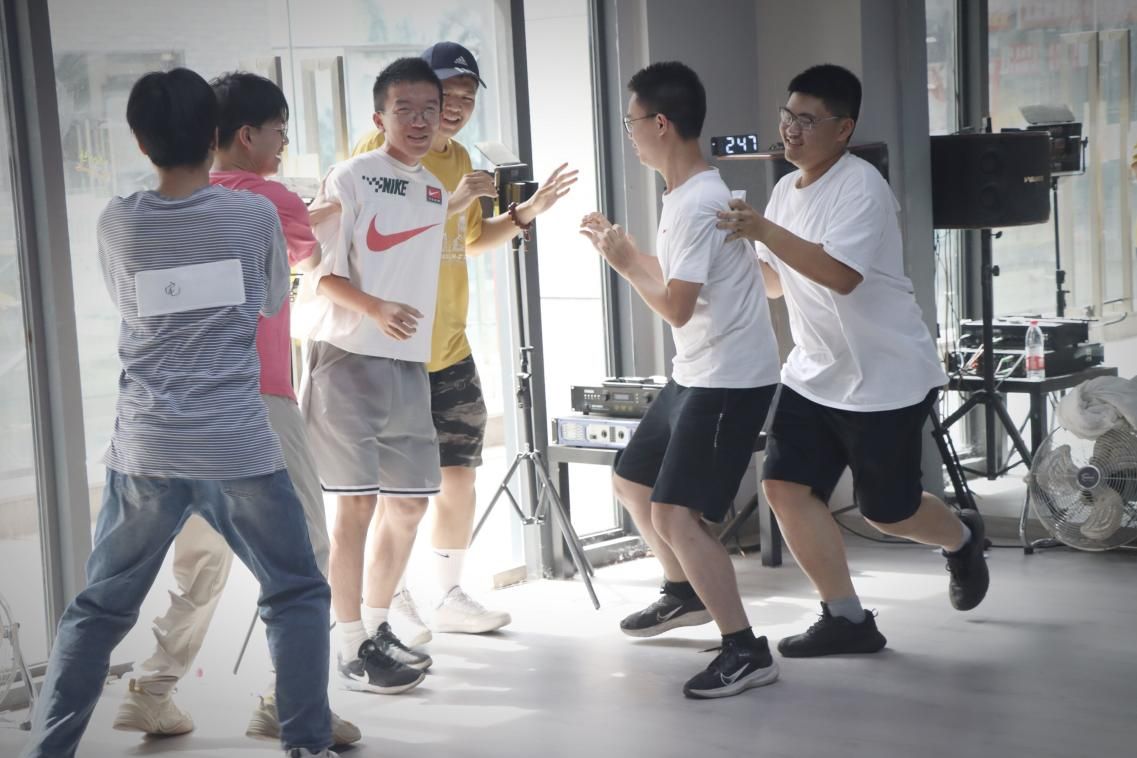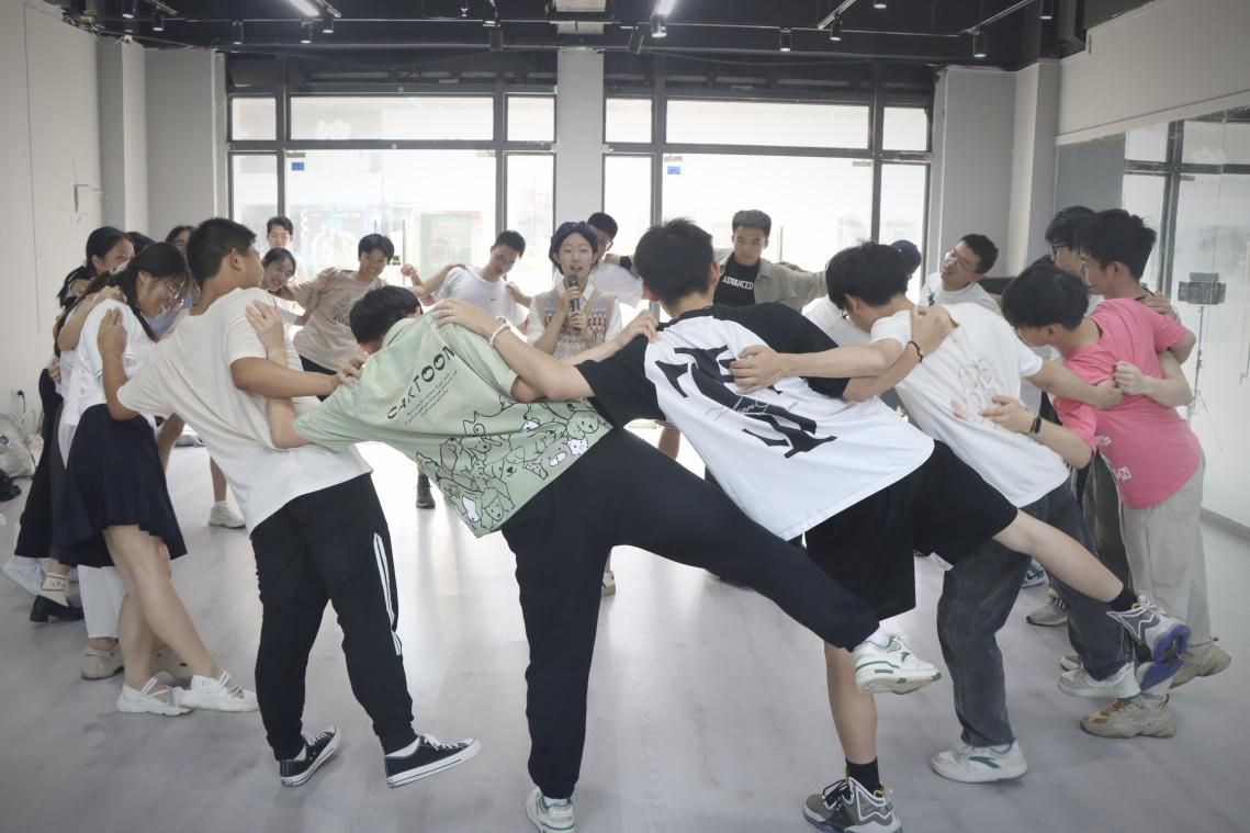 成员们在主持人的亲切带领下开展系列破冰游戏。“花开花落”趣味热身活动迅速点燃了现场的气氛。学生们围成一个大圆,双手搭在左右伙伴的肩膀上,随着裁判的口令——“花开”“花落”“风吹”“草动”“水落”“石出”,大家依次做出后仰、前屈、左仰、右仰、蹲下、踮脚等动作。这一环节的目的不仅是为后续的运动游戏项目热身,更是考验了成员们的协调性和反应速度,也通过身体的互动拉近了彼此的距离。