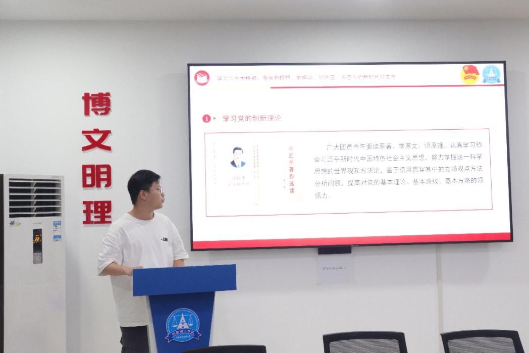 学生会主席团成员黄希哲分享了《习近平与大学生朋友们》的读书心得。她提到,《习近平与大学生朋友们》系列采访实录中的一个个故事、一段段回忆,不仅体现出党和人民对大学生寄予的无限期待,更反应了时代赋予青年的光荣责任。当代青年要坚定理想信念、练就过硬本领、勇于开拓创新,做德智体美劳全面发展的社会主义建设者和接班人,做有志气、有才气、有锐气的新时代大学生。