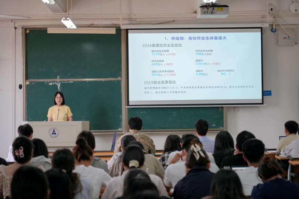 讲座伊始,兰玉娟老师对当前就业形式进行深入分析。她详细解读了2024届高校毕业生结构与2024年就业政策的导向,并指出学生在追求职业稳定与自由之间的矛盾心理以及行业景气程度波动下降的趋势,强调了当前就业市场供需不匹配的严峻现状。
