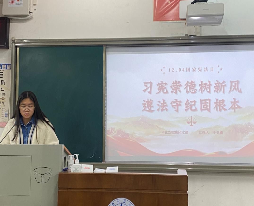 新闻网讯(学生通讯员 李莹)为弘扬宪法精神,维护宪法权威,12月12日,司法2202团支部于文澜104开展了国家宪法日主题团日活动,由组织委员李羽姗同学主讲。