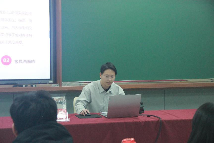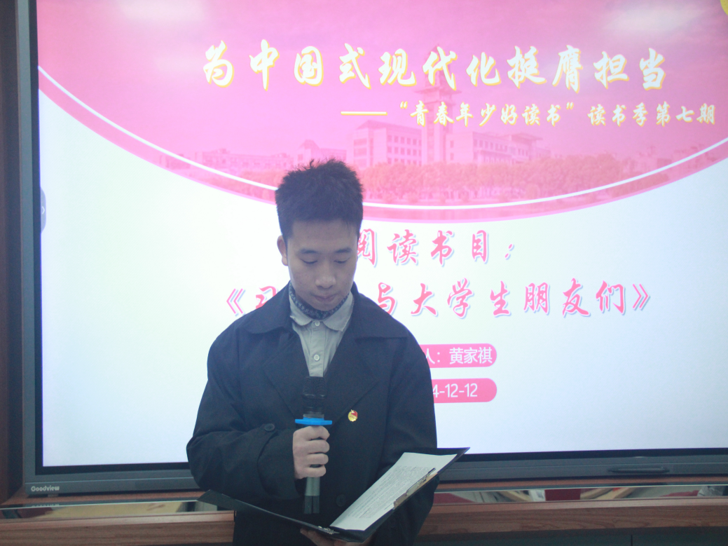 团委组织部部长黄家祺带领大家学习《习近平与大学生朋友们》一书的主要内容。黄家祺同学提到,本书通过49篇访谈实录,讲述习近平总书记深入高校调研考察、关心指导大学生的故事。黄家祺同学提到,新时代大学生应当以“立大志、明大德、成大才、担大任”为目标,练就过硬本领,勇于开拓创新,贴近基层实践,矢志不渝,艰苦奋斗,凝心聚力,真抓实干,开拓创新,为时代的蓬勃发展注入青春力量。