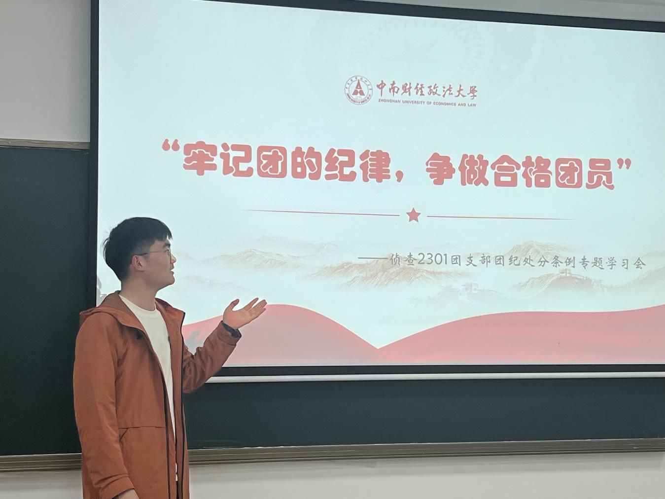 新闻网讯(学生通讯员 李博宇)为严肃团的纪律,纯洁团的组织,侦查2301团支部于3月24日在文泰108组织开展了《中国共产主义青年团纪律处分条例(试行)》专题学习会。