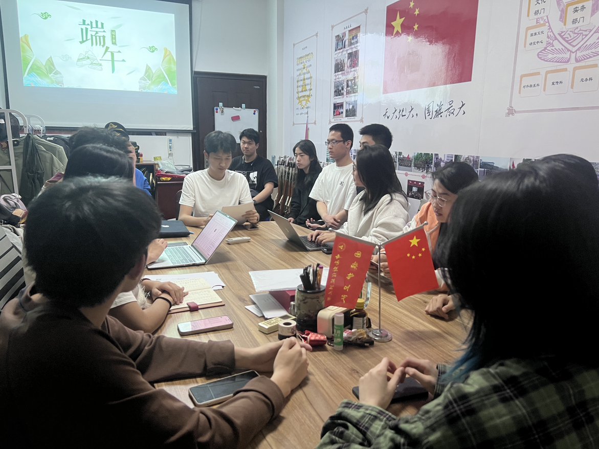 端午节是中华民族的传统节日,承载着深厚的家国情怀。为弘扬传统文化,增强队员的文化自信,中南财经政法大学国旗护卫队功能型团支部于2024年6月6日在文治楼一楼会议室召开“弘扬端午文化,传承家国情怀”主题团日活动,全体队员参加会议,功能型团支部书记赵俊尧担任主讲人。