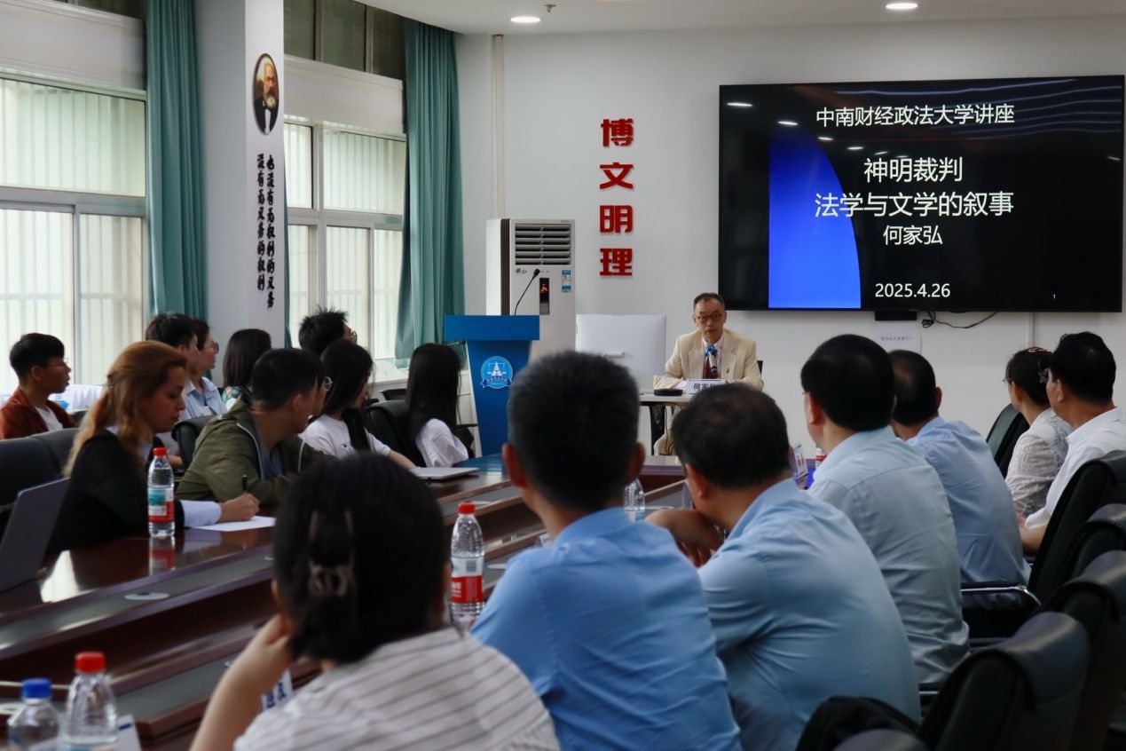 新闻网讯(学生通讯员 郭东来 摄影顾枨茗)4月26日15时,“神明裁判——法学与文学的叙事”主题学术讲座在中南财经政法大学南湖校区文治楼二楼会议室成功举办。本次讲座由中南财经政法大学“文澜学者”特邀教授、中国人民大学大华讲席教授、博士生导师何家弘教授主讲,nba在线看