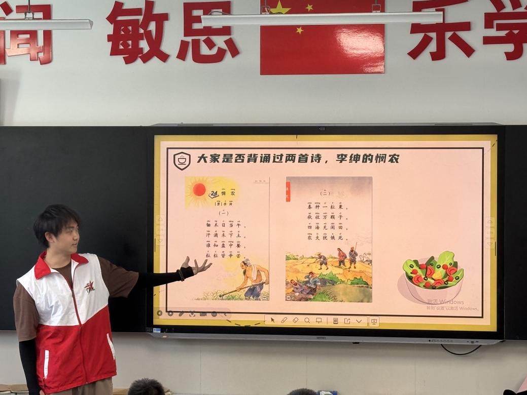 下午1时,在完成集合后,志愿者们前往光谷五小开展志愿宣讲活动。活动伊始,志愿者以两首古诗为引,引导同学们思考粮食与食品的问题,激发同学们的好奇心,帮助同学们更好的投入课堂。