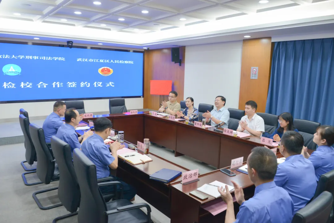 院长董邦俊教授,党委副书记徐庆祥、警事科学系主任林慧青副教授等师生代表,江夏区人民检察院党组书记、检察长李世军,党组成员、政治部主任裴国英,检察委员会专职委员李传国及各部门负责人参加会议。