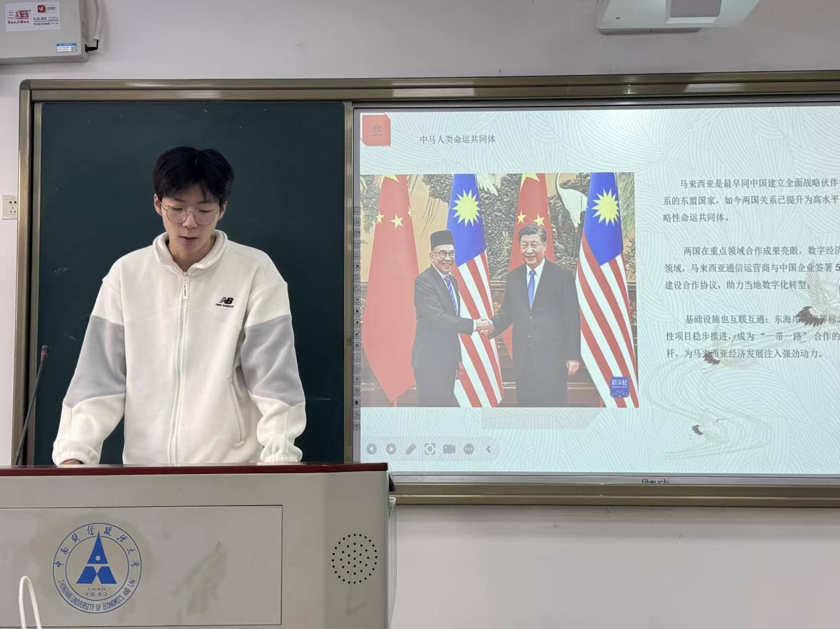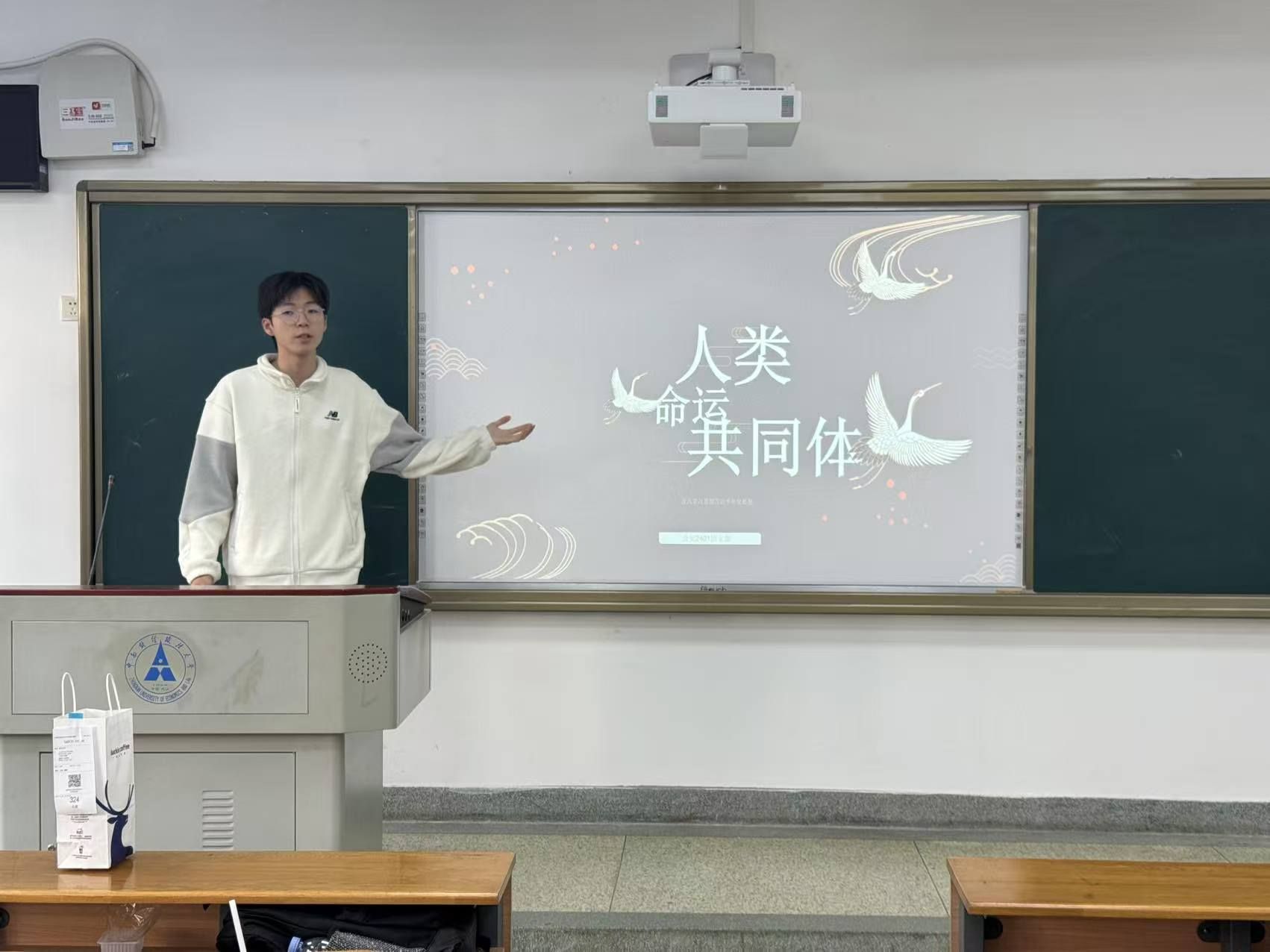 活动第一项,团支部书记胡炜韬同学详细解读了习近平总书记关于构建人类命运共同体的新理念、新主张和新倡议。带领支部全体成员学习了“亲诚惠容” 的周边外交理念,强调了中国坚持与邻为善、以邻为伴的决心,致力于促进地区和平稳定与繁荣发展的行动。