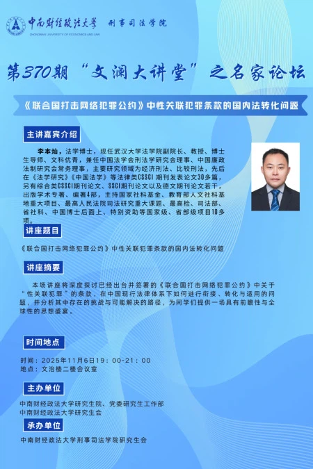 报告人:李本灿 报告题目:《〈联合国打击网络犯罪公约〉中性关联犯罪条款的国内法转化问题》 时间:2025年11月6日19:00 地点:文治楼二楼会议室 嘉宾介绍:李本灿,法学博士,现任武汉大学法nba在线看 副院长、教授、博士生导师、文科优青,兼任中国法学会刑法学研究会理事、中国廉政法制研究会常务理事,主要研究领域为经济刑法、比较刑法,先后在《法学研究》《中国法学》等法律类CSSCI 期刊发表论文30多篇,另有综合类CSSCI期刊论文、SSCI期刊论文以及德文期刊论文若干,出版学术专著、编著4部,主持国家社科基金、教育部人文社科基地重大项目、最高人民法院司法研究重大课题、最高检、司法部、省社科、中国博士后面上、特别资助等国家级、省部级项目10多项。 |