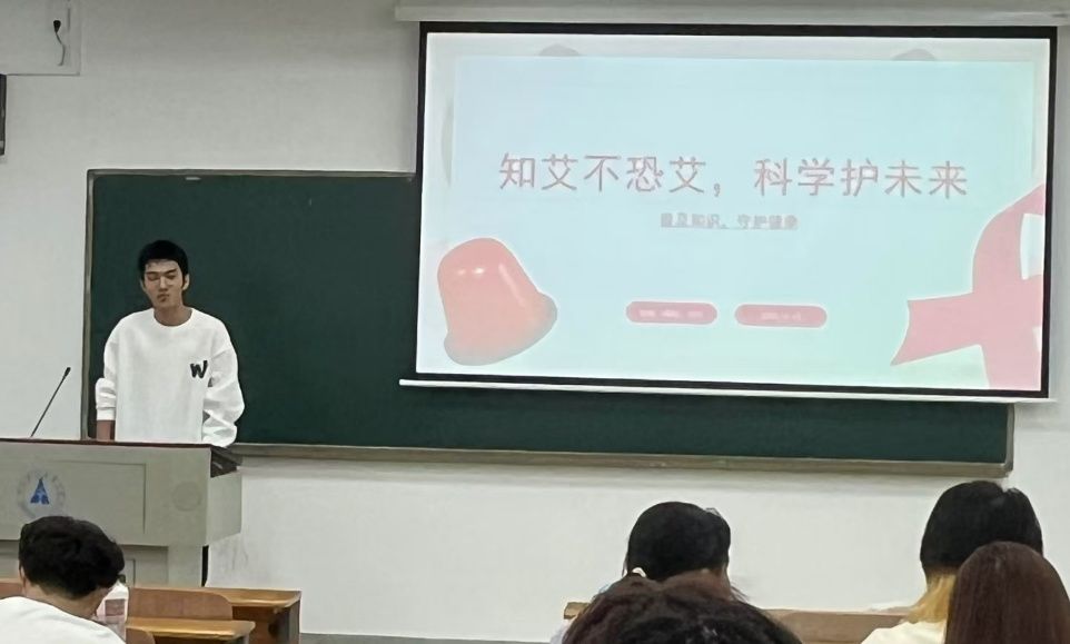 班会伊始,张腾原从“艾滋病并非遥不可及的‘他人之痛’,而是每个人都应关注的公共健康议题”切入,结合科学数据,系统讲解艾滋病的基本知识、传播途径与防治要点。他特别指出,HIV病毒主要通过性接触、血液和母婴传播,日常握手、共餐、拥抱等接触不会感染,强调“知艾”而不“恐艾”的重要性,呼吁同学们掌握科学防护知识,消除偏见与误解。他还提醒大家在大学阶段树立正确的恋爱观与性观念,坚持安全性行为,远离毒品,做到对自己与他人负责。